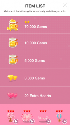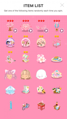 Spring spin – Line Play by applebaby // March 24, 2015 3000gems per spin Have a chance to get animated aura and side aura! Prize list in the screen shot 🙂 Share our happiness